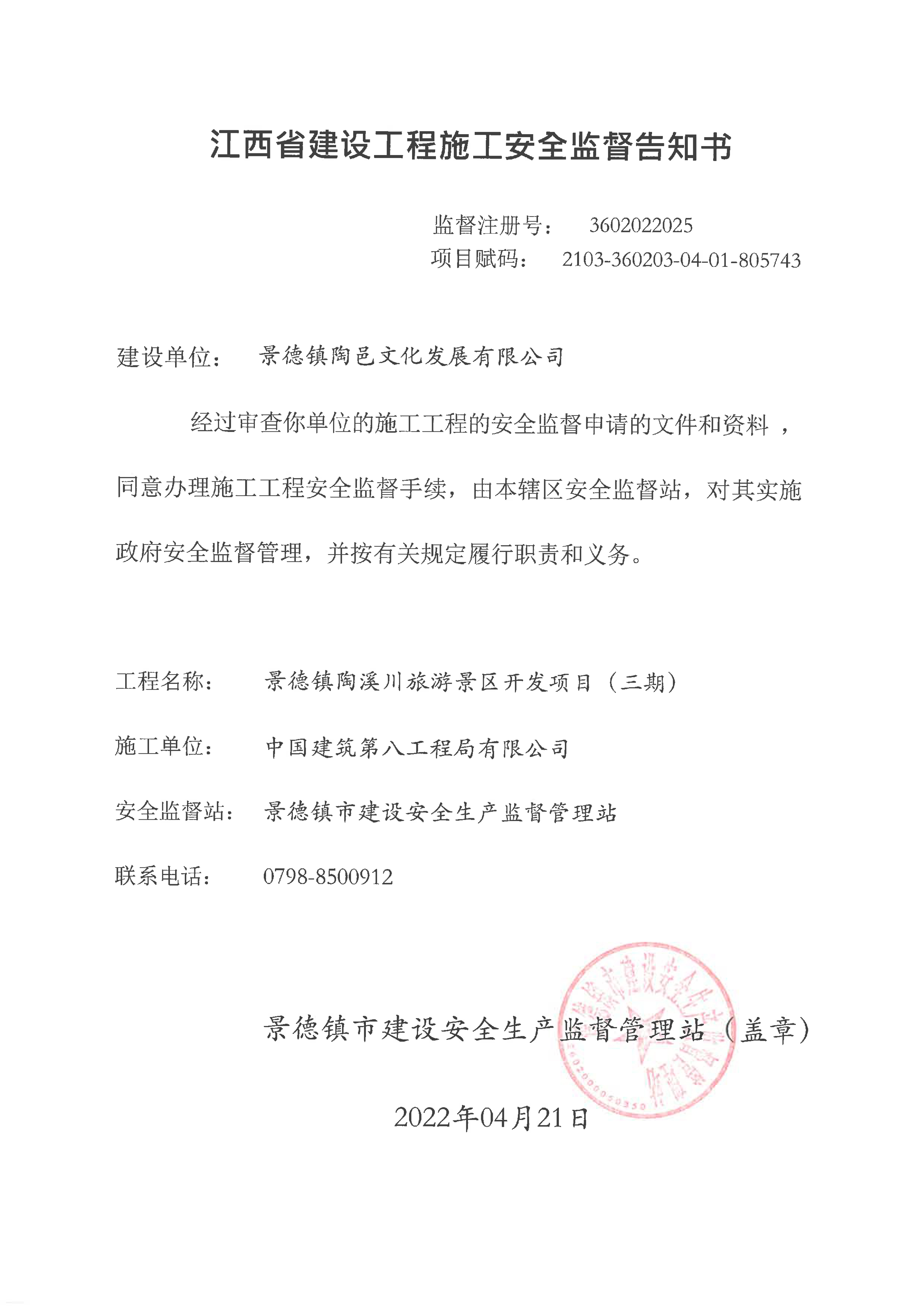 景德镇陶溪川旅游景区开发项目(三期)建设工程施工安全监督告知书