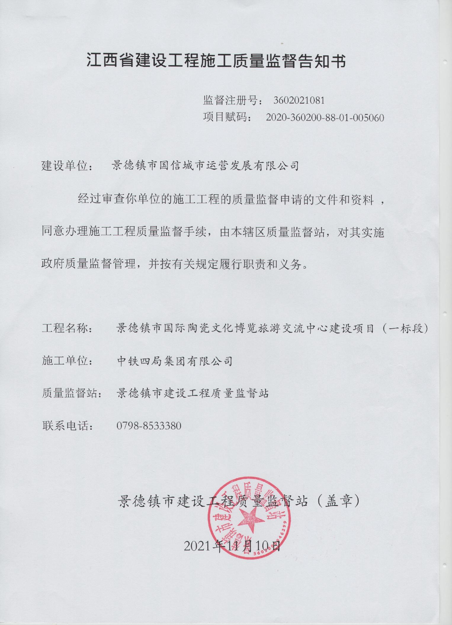 景德镇市国际陶瓷文化博览旅游交流中心建设项目(一标段)(质量监督告知书)