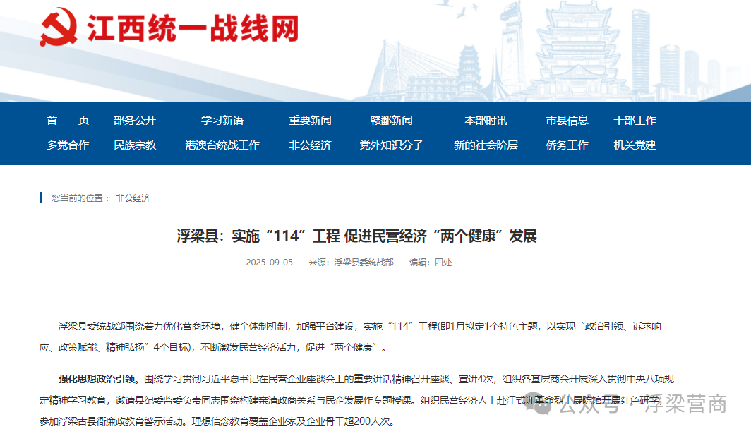 浮梁县委统战部围绕着力优化营商环境,健全体制机制,加强平台建设,实施“114”工程(即1月拟定1个特色主题,以实现“政治引领、诉求响应、政策赋能、精神弘扬”4个目标),不断激发民营经济活力,促进“两个健康”。