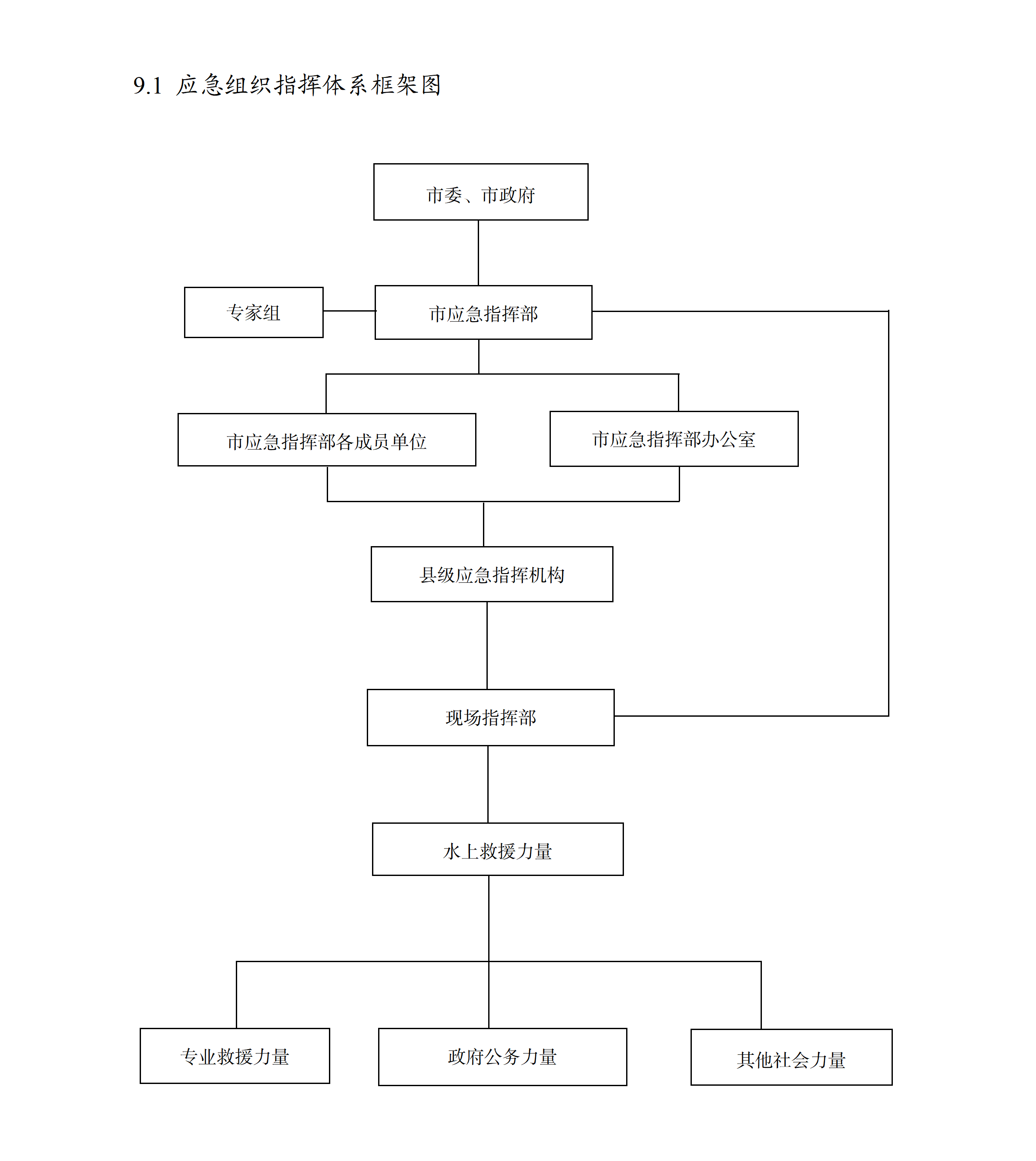 在市政府的领导下,设立处置水上突发事件应急指挥部(以下简称市应急指挥部),负责组织协调指挥全市水上突发事件防范和应对工作。处置水上突发事件应急组织指挥体系由应急指挥机构、运行管理机构、专家组、现场指挥机构、应急救援力量等组成。