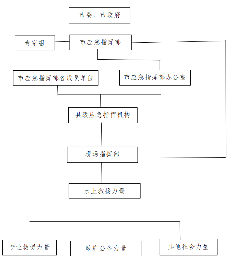在市政府的领导下,设立处置水上突发事件应急指挥部(以下简称市应急指挥部),负责组织协调指挥全市水上突发事件防范和应对工作。处置水上突发事件应急组织指挥体系由应急指挥机构、运行管理机构、专家组、现场指挥机构、应急救援力量等组成。
