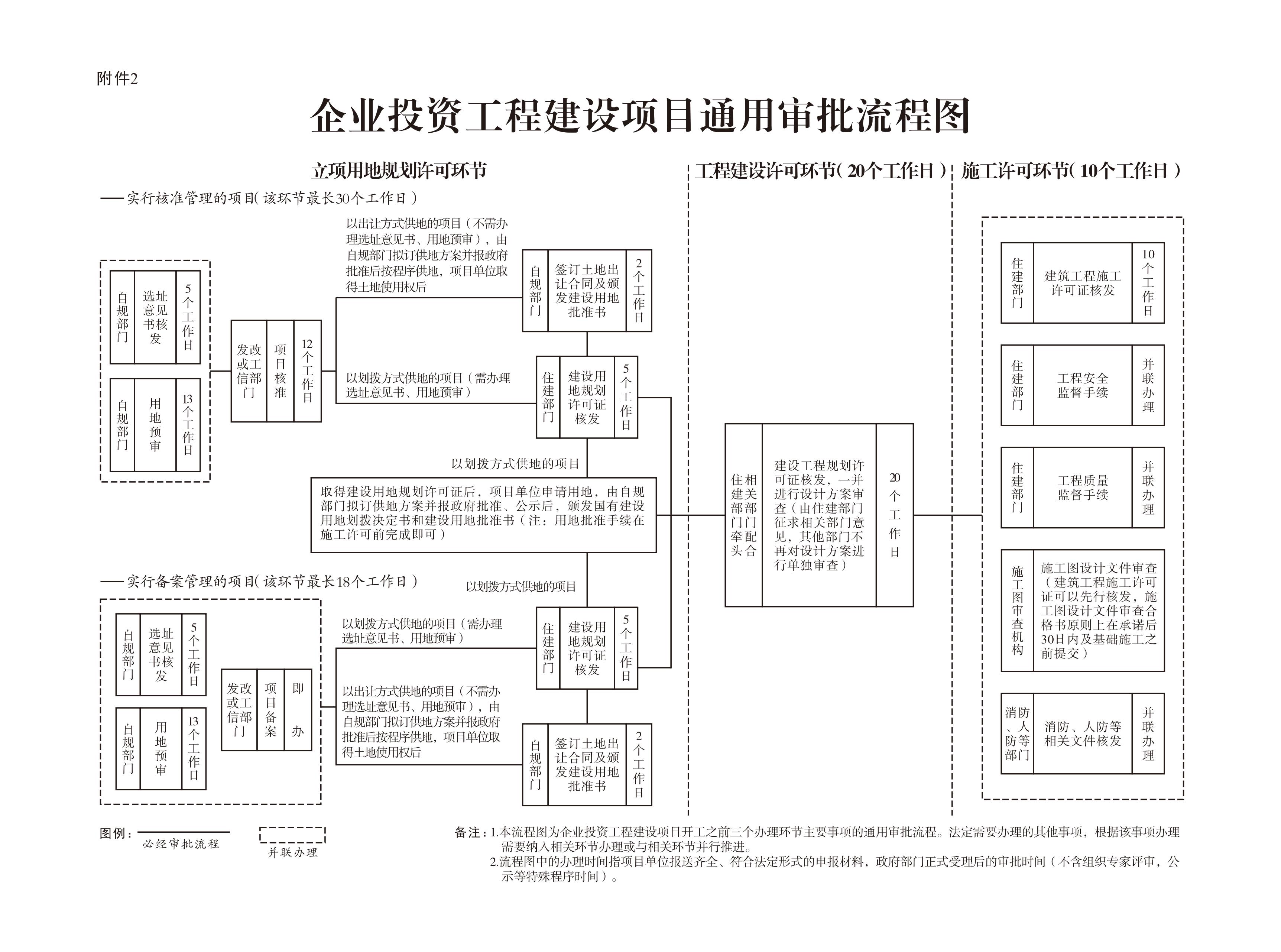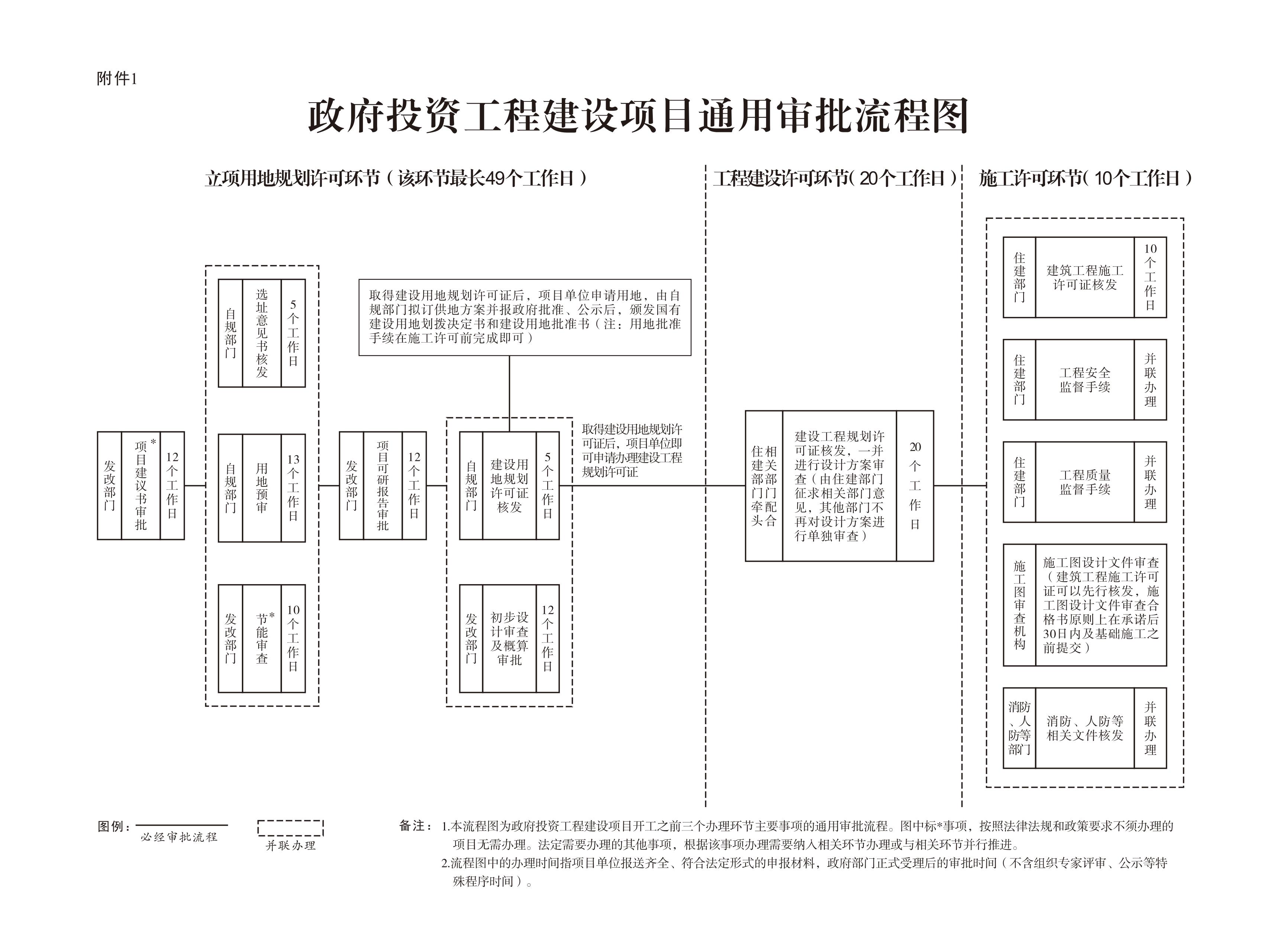 (一)改革工程建设项目审批制度。对工程建设项目(主要是房屋建筑和城市基础设施等工程,不包括特殊工程和交通、水利、能源等领域的重大工程),2019年上半年建成审批制度框架和管理体系,大幅压减开工之前审批时间,其中政府投资项目压减至79个工作日以内(见附件1),企业投资项目压减至60个工作日以内(见附件2);2020年基本建成全市统一的审批制度框架和管理体系。