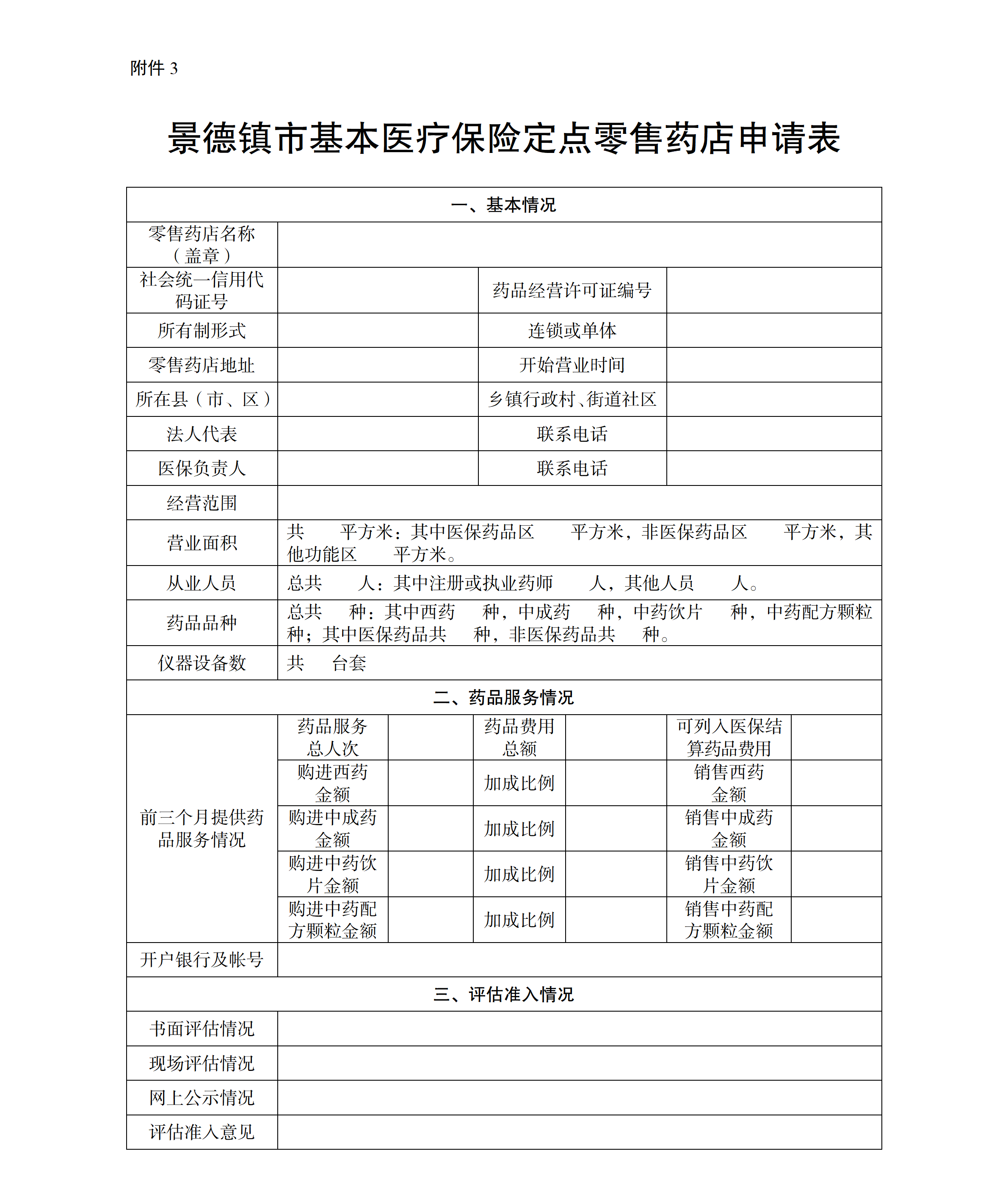 (一)景德镇市基本医疗保险定点零售药店申请表(附件3)。