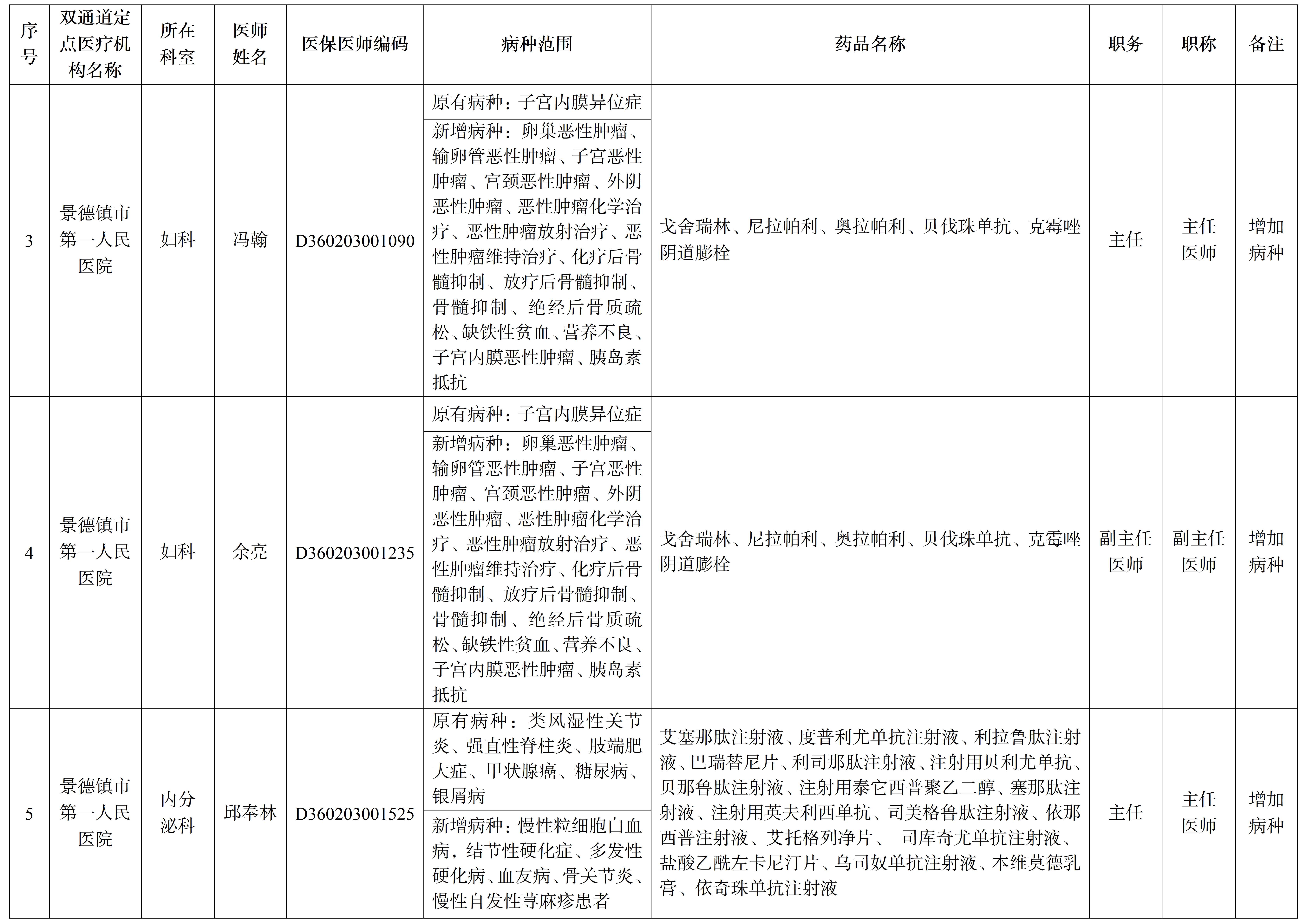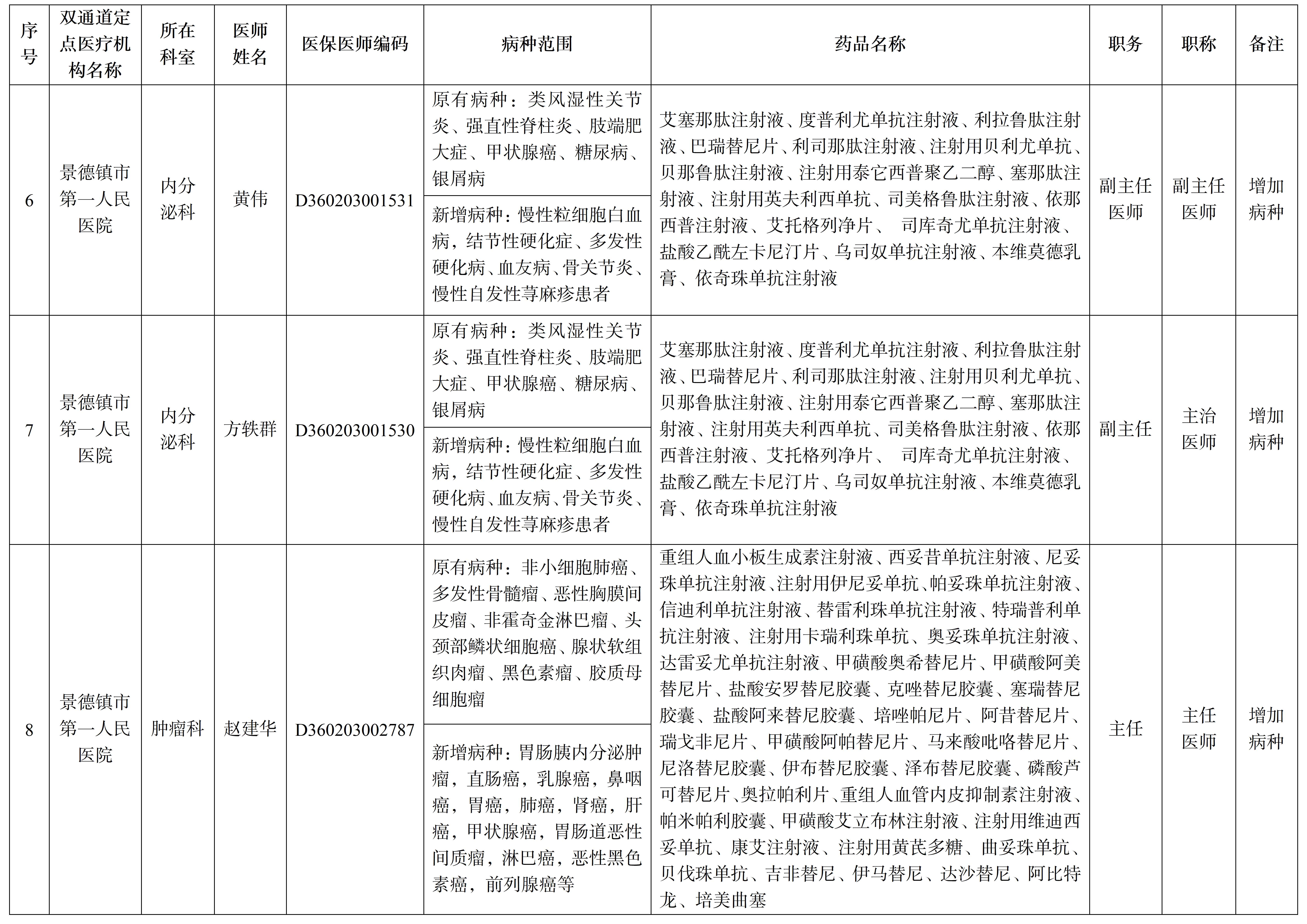 按照《江西省双通道谈判药品管理暂行办法》规定和《江西省医保药品分类与代码数据库》更新执行的双通道药品适用范围,现依规新增定点医疗机构双通道药品定点责任医师及调整部分责任医师病种范围。