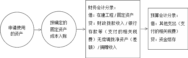 属于无偿划转的,申请使用的资产,按照调出单位资产净值,借记“固定资产”科目[不需安装]或“在建工程”科目[需安装],按照发生的相关税费、运输费等,贷记“财政拨款收入” “银行存款”等科目,按照其差额,贷记“无偿调拨净资产”科目。属于捐赠资产的,按照其差额,贷记“捐赠收入”科目。如无偿划转或捐赠资产净值为0,则按照固定资产原值借记“固定资产”,贷记“固定资产累计折旧”。