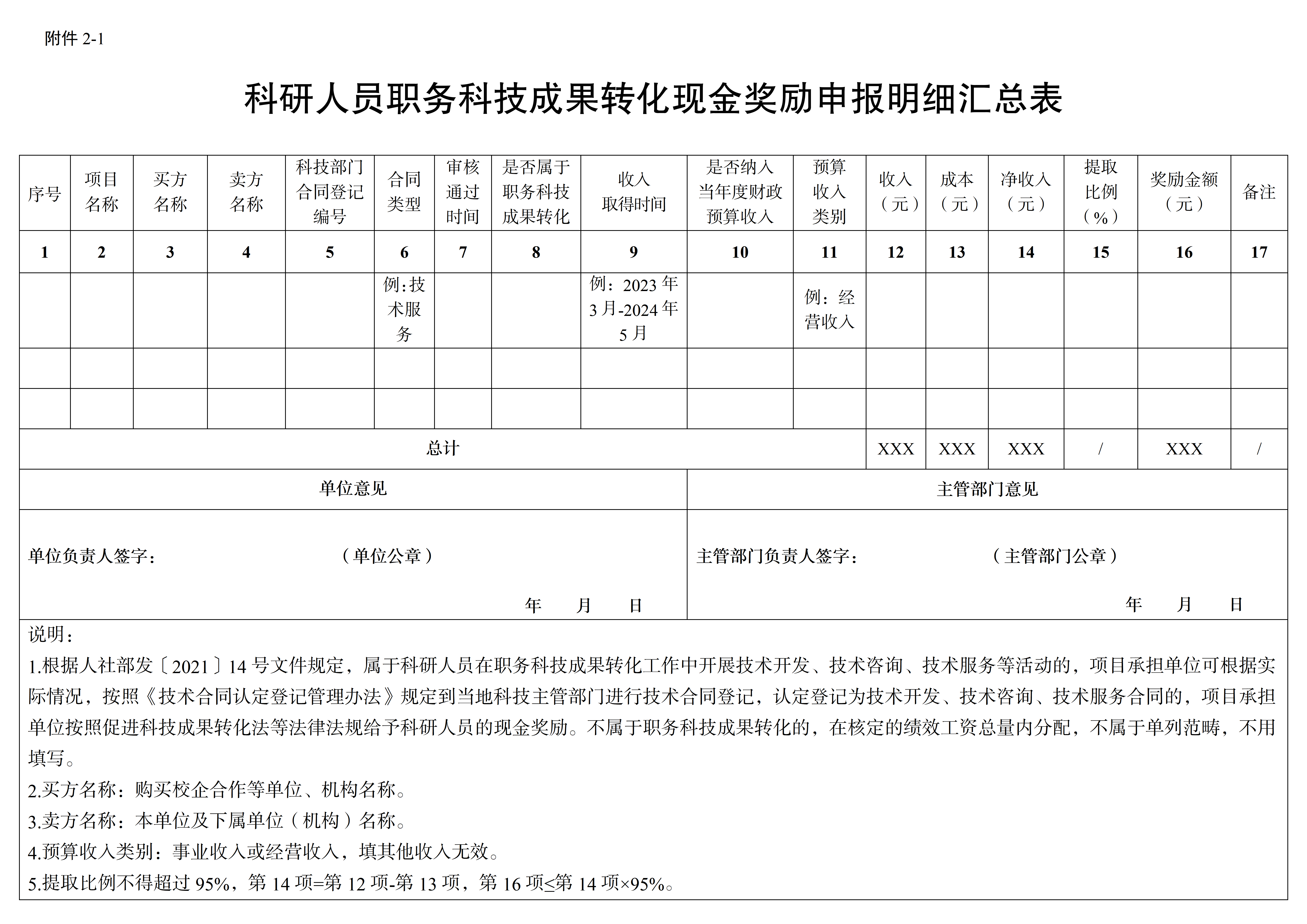 附件2-1:科研人员职务科技成果转化现金奖励申报明细汇总表