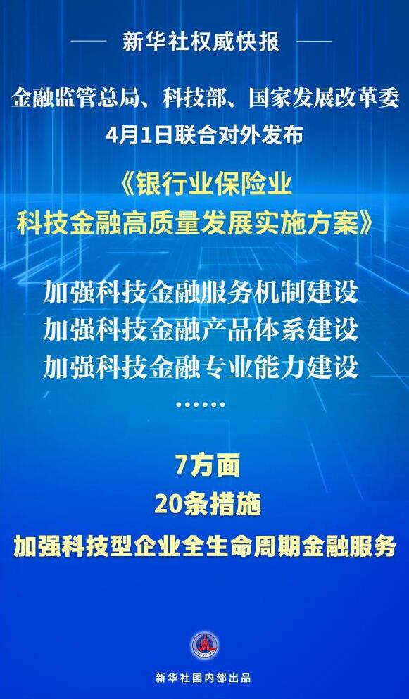 新华社北京4月1日电(记者李延霞、张千千)金融监管总局、科技部、国家发展改革委1日联合对外发布《银行业保险业科技金融高质量发展实施方案》,从加强科技金融服务机制、产品体系、专业能力和风控能力建设等方面提出具体举措,引导金融机构进一步加强科技型企业全生命周期金融服务。