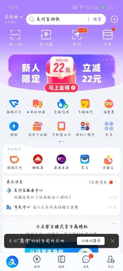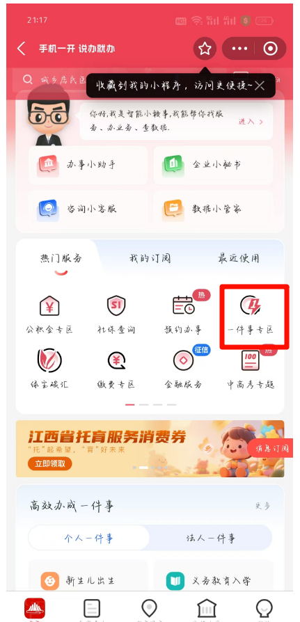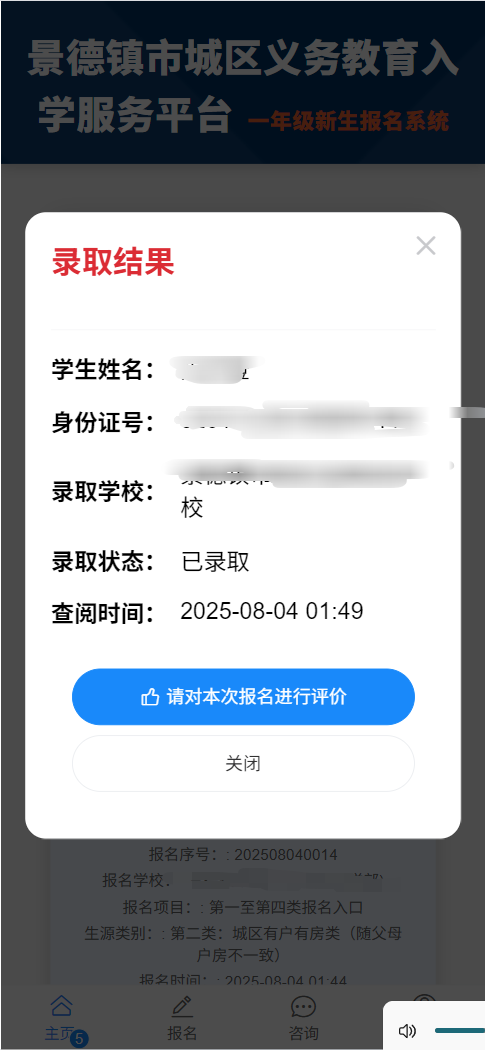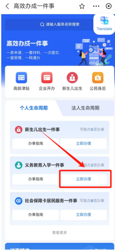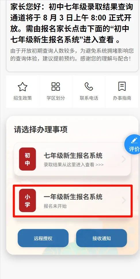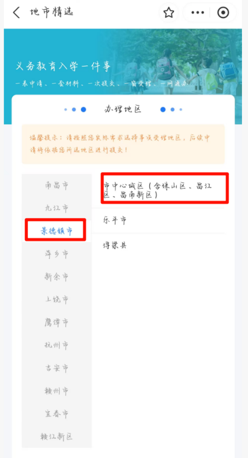 登录“支付宝”,搜索“赣服通”后进入赣服通小程序。在“热门服务”中选择“一件事专区”→在义务教育入学一件事中点击“立即办理”,选择景德镇市→市中心城区→一年级新生报名系统。