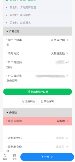 户主人脸核验:填写户口本成员姓名、身份证号,只要在同一个户口本上的就可以进行刷脸验证,获取户籍信息,并选择报名学生。这里以双胞胎为例,填写双胞胎信息,最后点击“下一步”。