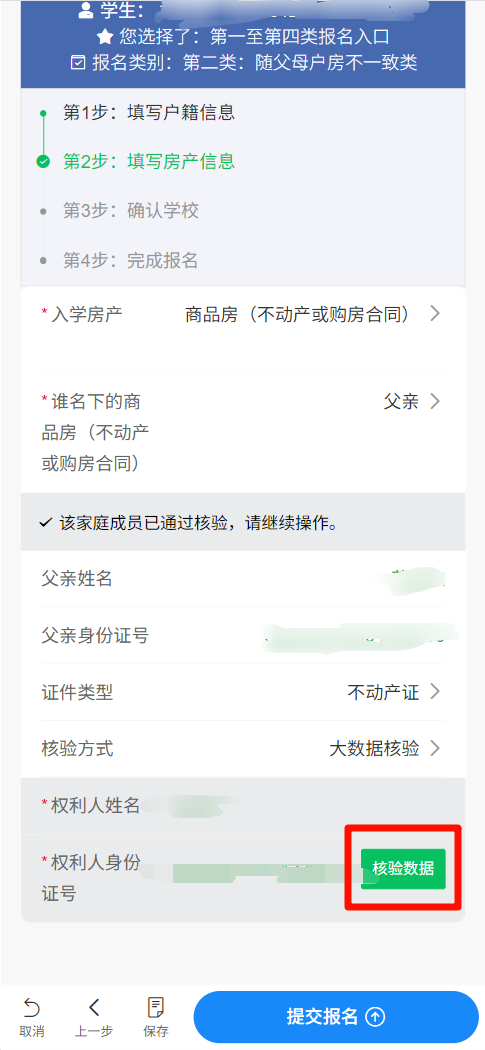 填写学生姓名、身份证号、家长联系电话1、家长联系电话2、报名类别,这里以第二类:随父母户房不一致为例