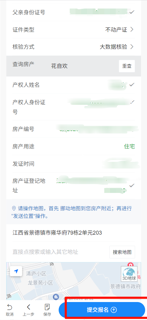 4.选择入学的房产和谁名下的房产,填写对应的信息,点击提交报名