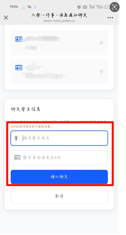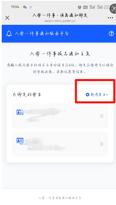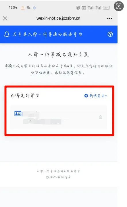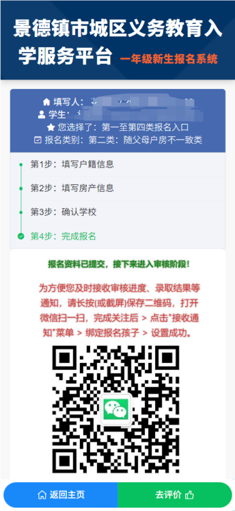 提示“报名提交成功”,“返回主页”后,可看到报名的学生及审核状态。微信扫描二维码进行微信消息推送绑定。