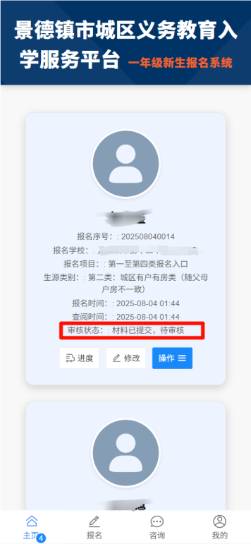 2.点击返回主页,显示报名成功的信息,“待审核” |