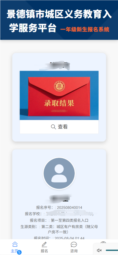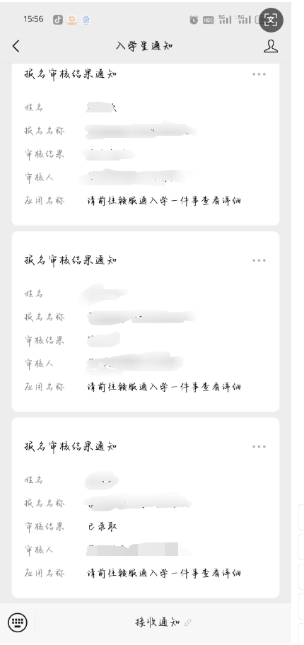 注意:接收报名信息,只有材料已提交、待审核,审核通过/审核不通过、录取/不录取,才会收到对应的信息,其他时间不会有任何信息发送。