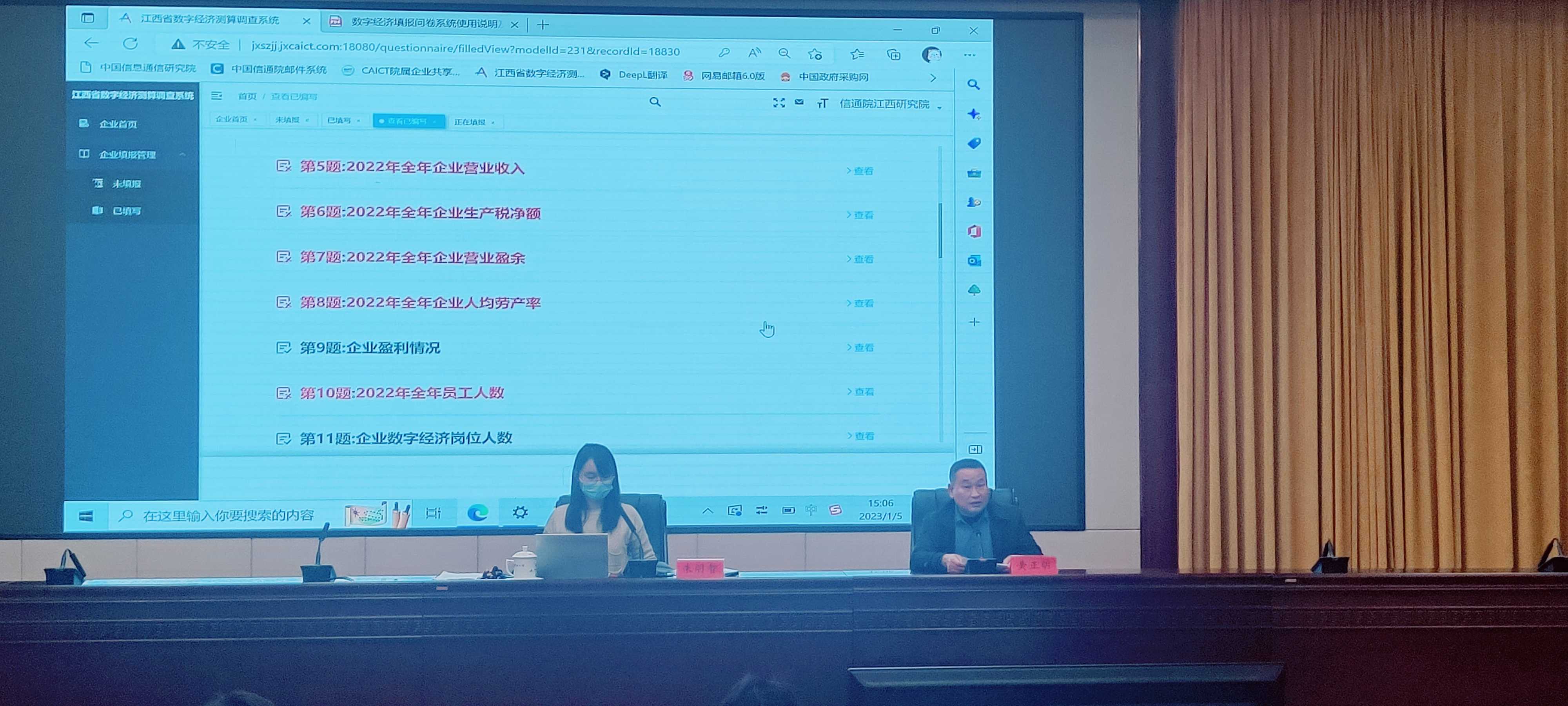为贯彻落实《江西省数字经济发展水平监测评价办法(试行)》文件精神,支撑2022年我市数字经济发展水平总结评估。1月5日,市数字经济办举办全市数字经济增加值测算工作宣贯培训会。此次培训邀请了中国信通院江西研究院数字经济部工程师王健、朱明智两位专家组织宣贯。市数字经济发展中心主任黄正明,各县(市、区)发改系统负责同志以及相关重点企业家代表约120人参加培训会。乐平市以电视电话会议的形式同步参加。