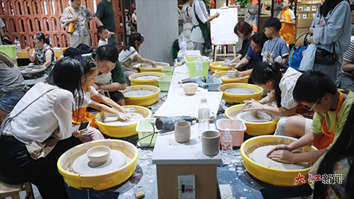 游客在手作区体验拉坯。