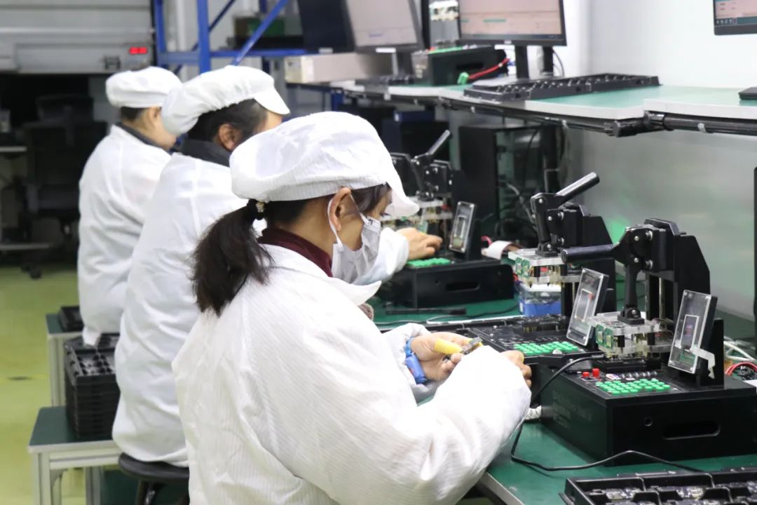 2月24日上午,在江西以晴5G数字经济产业园SMT车间内,50多名工人在进行手机主板贴片加工和手机主板自动化测试,现场一片火热的生产场面。