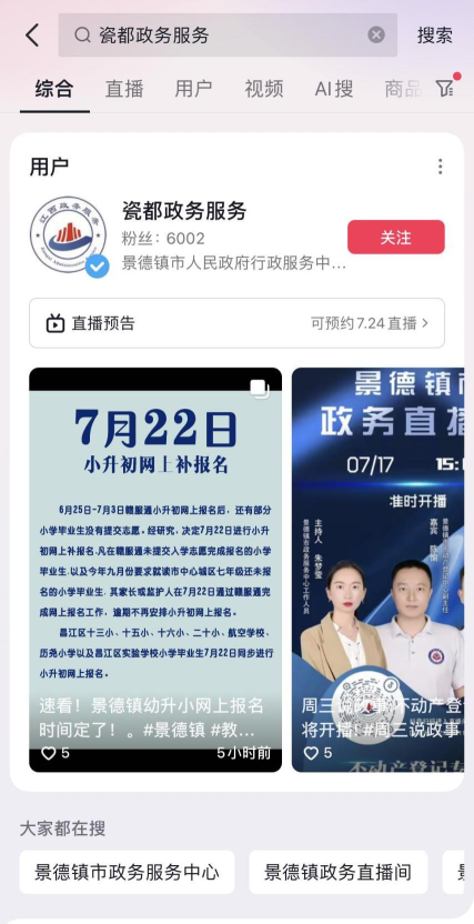 1、抖音搜索“瓷都政务服务”,点击关注,进入政务账号。